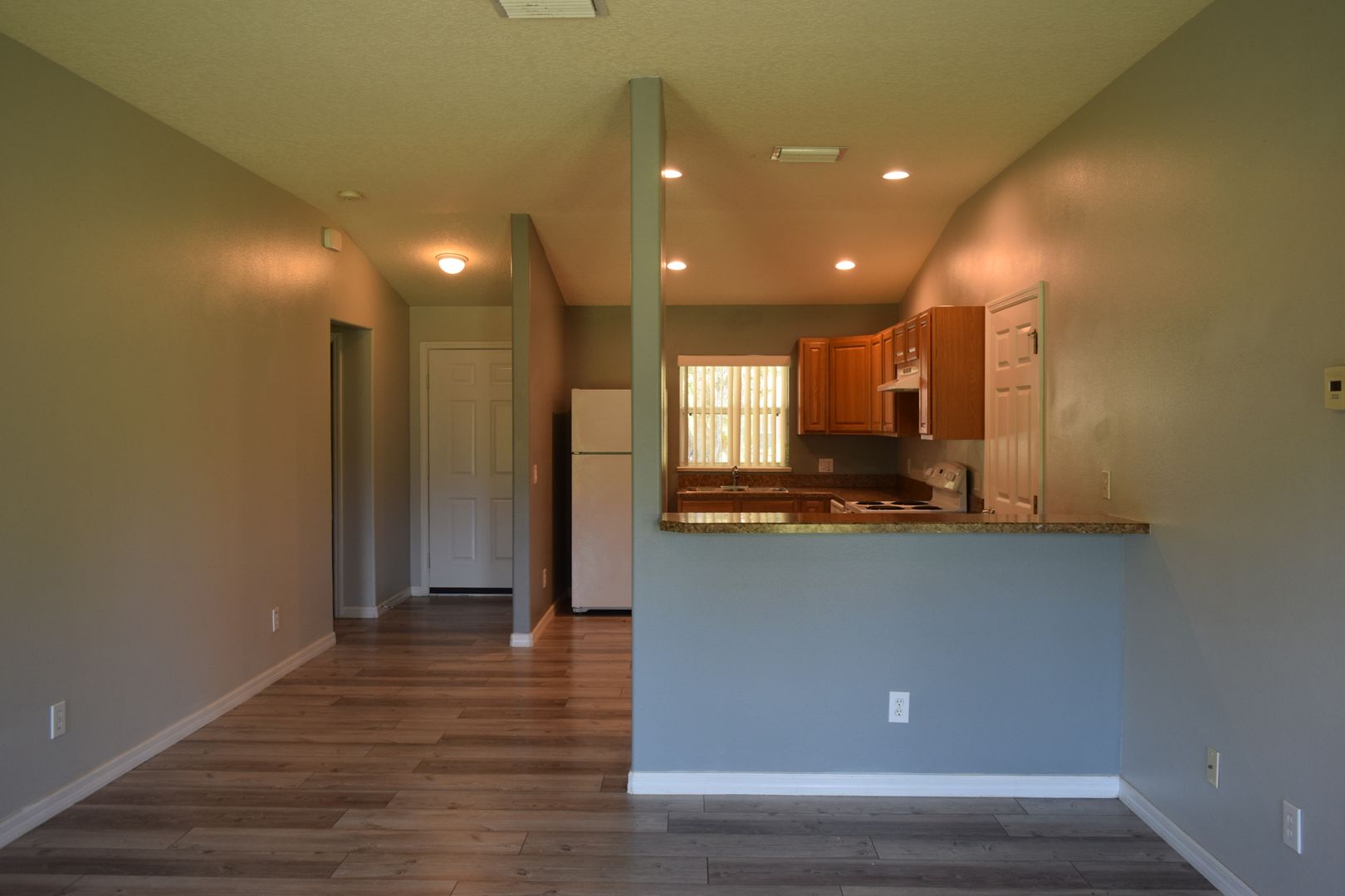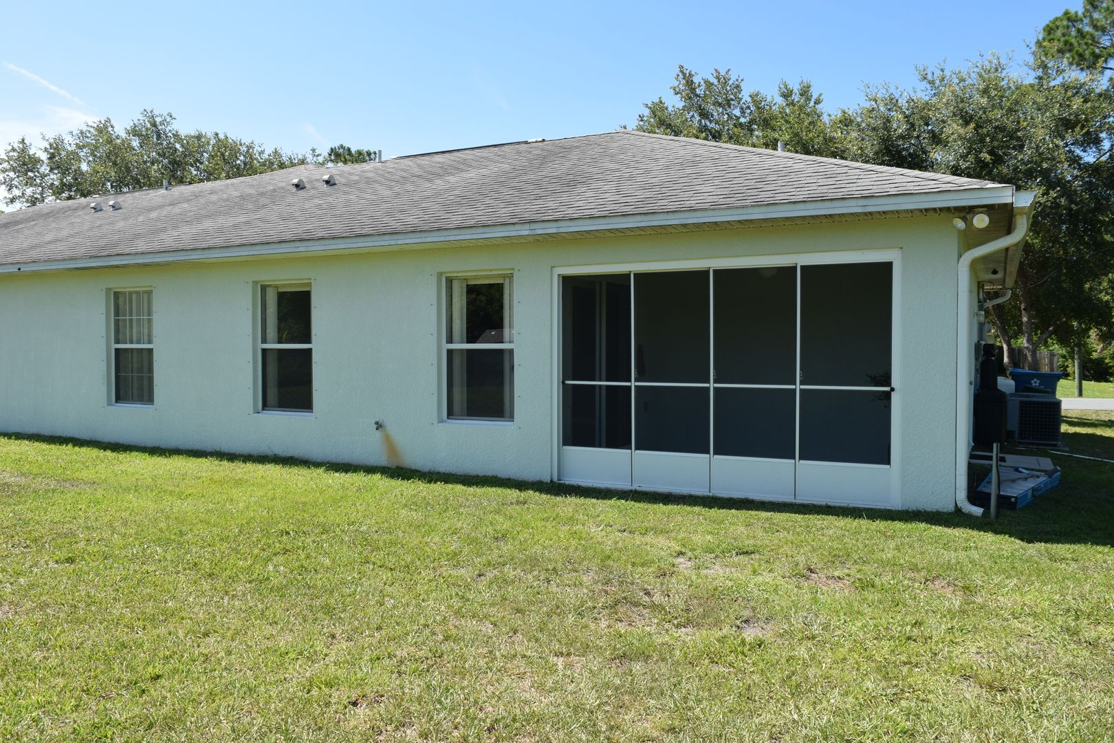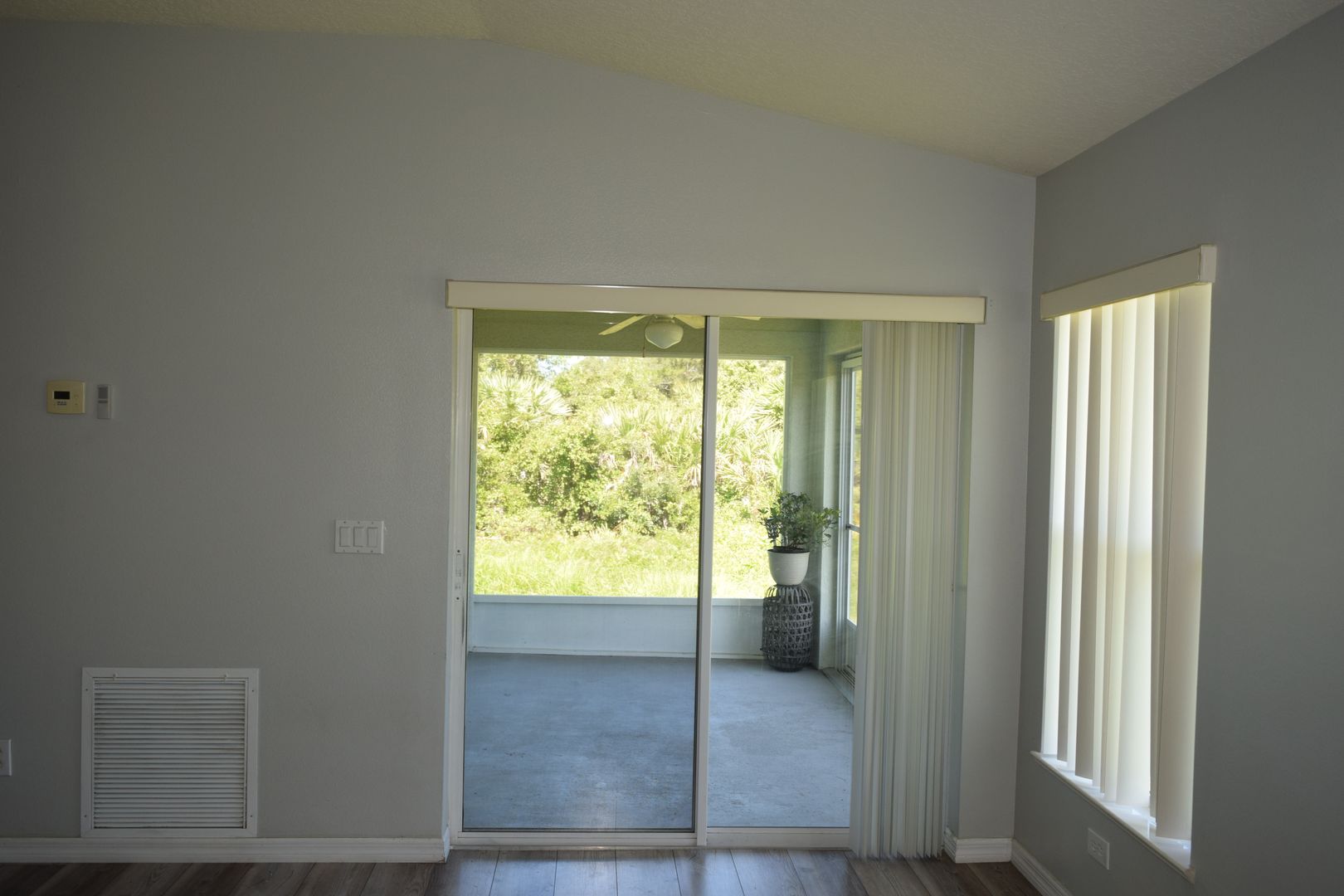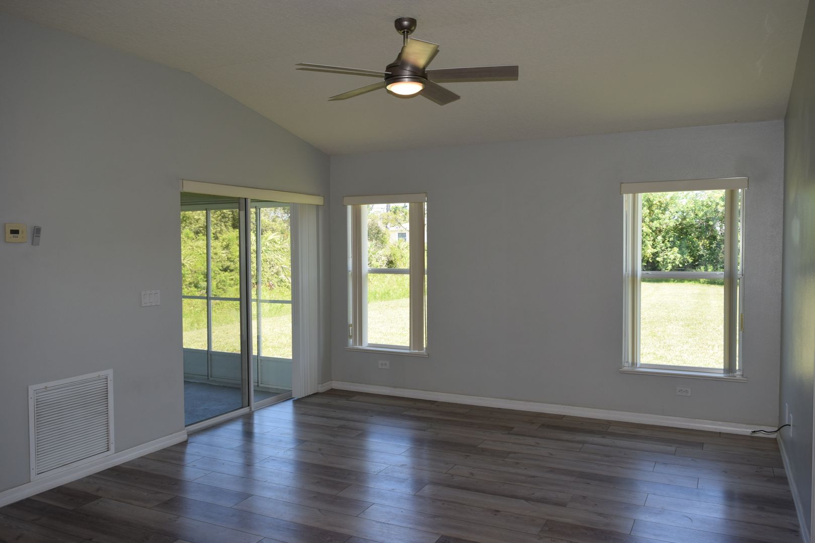 Don't miss out on this inviting 2 Bedroom, 2 Bath Duplex located in a desirable Southeast Palm Bay neighborhood, This light and airy home features an open floor plan with luxury vinyl plank flooring and ceiling fans throughout. Home boasts a spacious living/dining combo with sliders to screened porch. Nice size kitchen with breakfast bar and plenty of counter and cabinet space. The primary suite offers a large step-in shower, while the second large bathroom includes a full-size tub. Enjoy the expansive backyard—perfect for relaxing or entertaining—and a shaded front yard with mature trees. Basic lawn care included. Additional highlights include a 1-car garage and washer/dryer hookups for added convenience. Country like setting but close to main roads, I95, shopping and restaurants. A great place to call home! Unit A & B available for immediate occupancy !